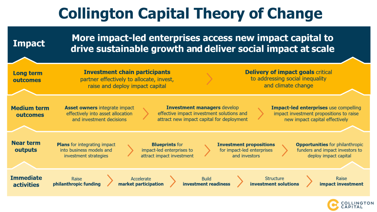 • Expertise includes both proposition advice and capital raising. The group structure includes an impact advisory partnership and an impact investment bank. This enables Collington Capital to partner with its clients on the journey from building investment readiness to raising investment capital.